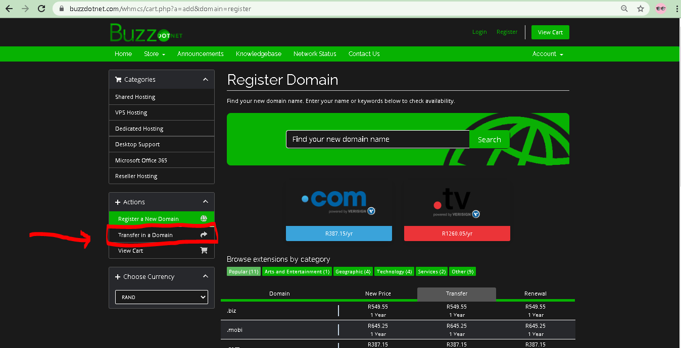 3. Redirected to below Page -Click Transfer in domain as shown (Red Box)