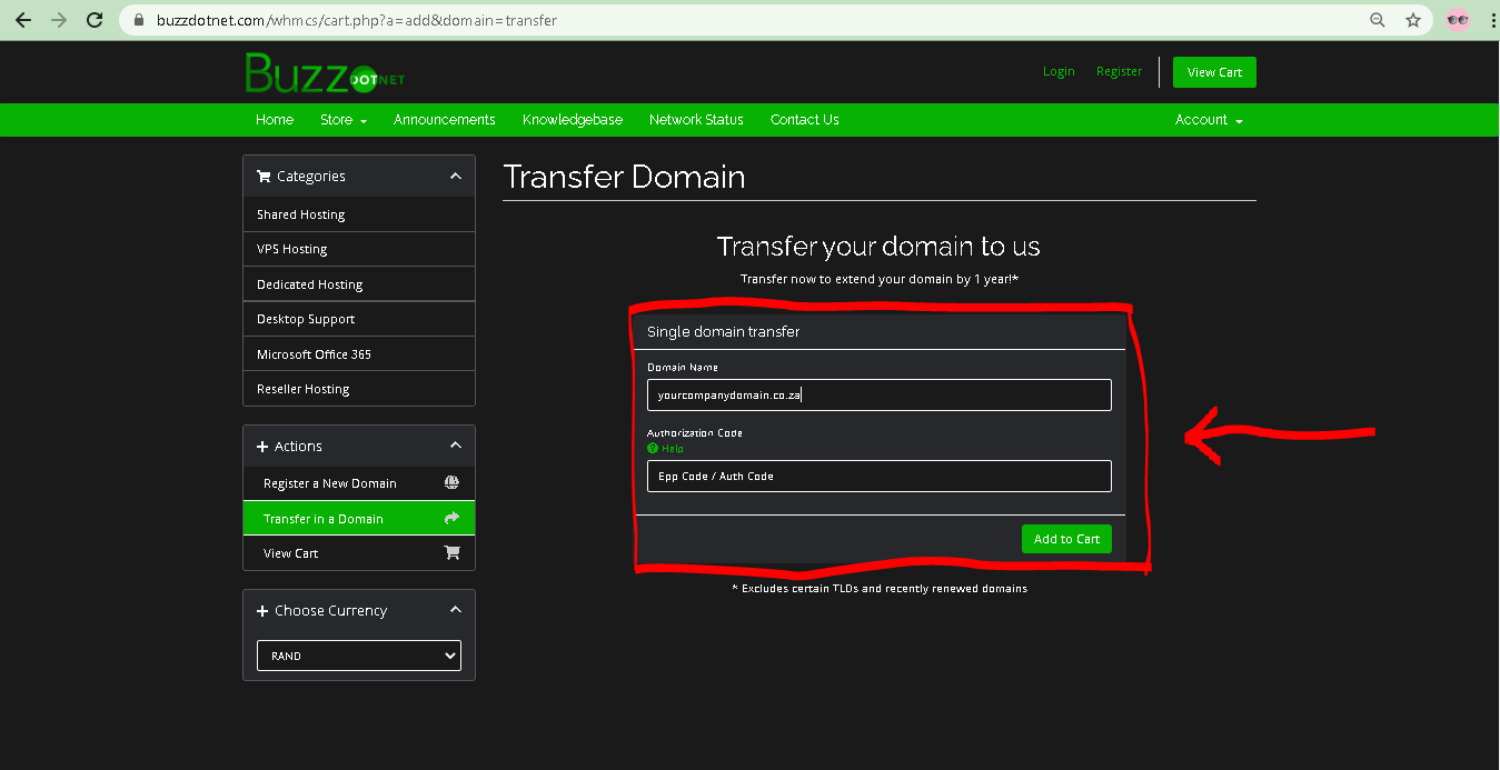 4. Redirected to below page – Type in your domain name and EPP code received from your current Hosting company, Click add to cart as shown (Red Box)