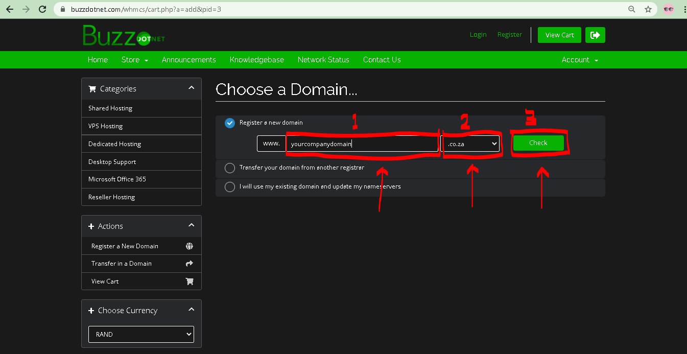 5. Redirected to below page – Type in your domain name, choose your TLD choice and click check as shown below (Red Box)